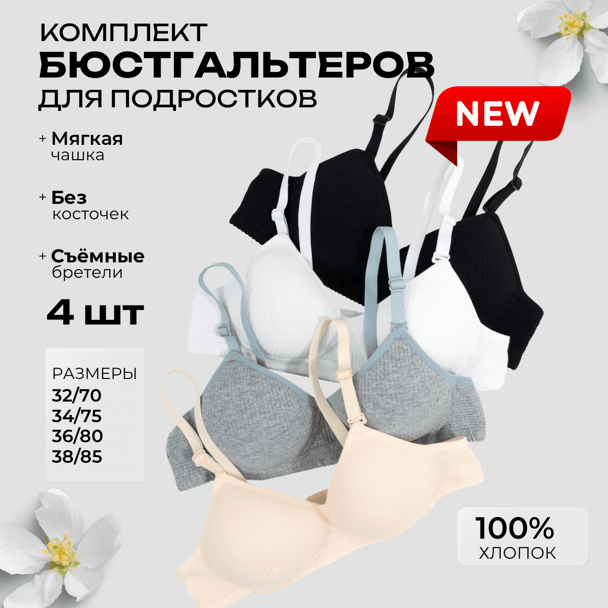 Набор из четырех бюстгальтеров для подростков выполнен из мягкого и дышащего хлопка, что обеспечивает комфорт в течение всего дня. Модель имеет удобную форму и анатомический крой, идеально подстраиваясь под фигуру. Бюстгальтеры представлены в разных цветах и принтах, что позволяет выбрать стиль по настроению. Эластичные бретели и застежка на спине обеспечивают надежную поддержку без излишнего давления. Этот набор станет отличным выбором для формирования базового гардероба.